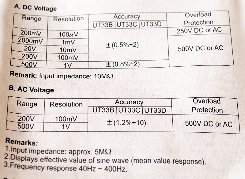 Teraz z innej beczki. Zdjęcie fragmentu instrukcji multimetru UNI-T UT33C. Pierwsza tabelka dotyczy napięcia stałego, druga przemiennego. Mamy też informacje o zabezpieczeniu w kolumnie „overload protection”.