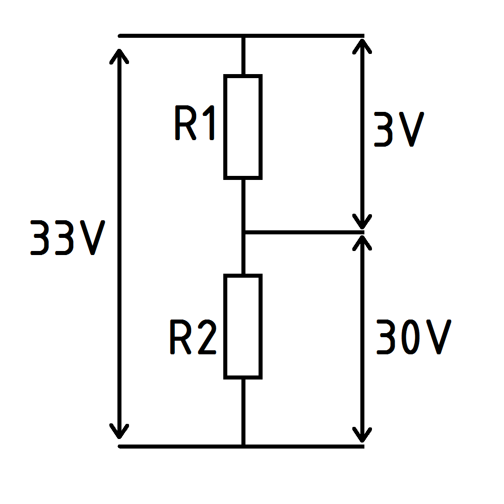 Zauważ pewien ciekawy fakt. Na wyjściu chcemy uzyskać dwa różne napięcia: 3V i 30V. Co je łączy? Jedno jest większe od drugiego dokładnie 10 razy. Patrząc z innej perspektywy, na wyjściu chcemy uzyskać stosunek napięć 1:10. Taki też powinien być stosunek wartości rezystancji. Jeśli na rezystorze $\rm{R_{1}}$ oczekujemy spadku napięcia 3V to rezystancja $\rm{R_{2}}$ musi być 10 razy większa od $\rm{R_{1}}$. Które rezystory pasują do tej układanki? Przypominam, że do dyspozycji mamy: