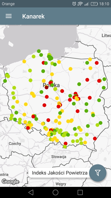 Powyżej mapa Polski z zaznaczonymi punktami. Każda taka kropka symbolizuje stację pomiarową. Kolor kropki mówi z kolei o jakości powietrza. Zielona kropka to czyste powietrze. Im bardziej idziemy w czerwień tym powietrze jest bardziej zanieczyszczone. Czystość tego czym oddychamy określana jest tutaj przez Indeks Jakości Powietrza. W aplikacji jest to domyślny parametr. Mamy też możliwość wyświetlania innych wskaźników.