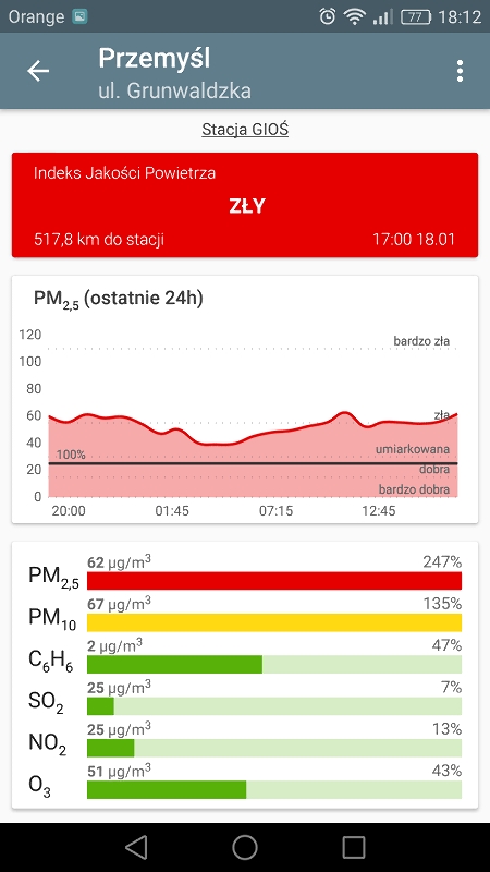Klikając, a właściwie pukając w daną kropkę możemy zajrzeć do bardziej szczegółowych wyników pomiarów. Mamy wykres pomiarów dla danego parametru z ostatnich 24h. Taki wykres fajnie obrazuje jakość powietrza w ciągu dnia. Czasem okazuje się, że w sumie jest źle, ale tylko w określonych godzinach. O nieco innej porze można nawet wyjść pobiegać. I to bez maski.