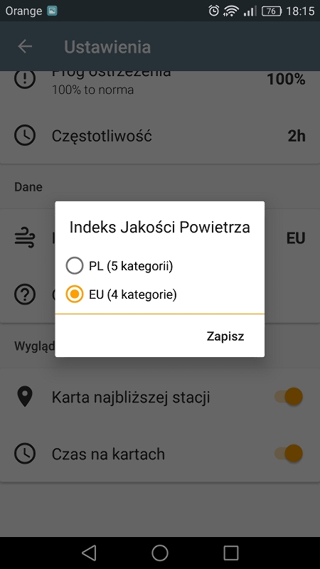 Mamy też możliwość zmiany wykorzystywanego Indeksu Jakości Powietrza.